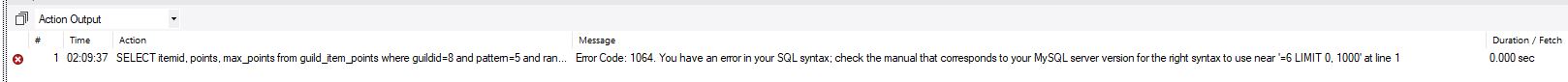 SQL: SELECT itemid, points, max_points FROM guild_item_points WHERE guildid = 8 AND pattern = 5 AND rank = 6