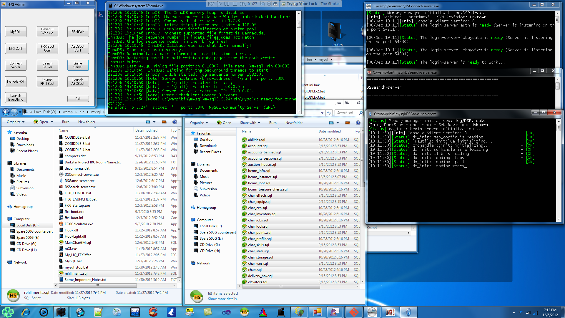 I rewrote all of the batch files, but now they also include mysqld.exe, and mxi.exe. Not only that, the batch file opens the config files for FFXICalculator.exe and Client.ini (for mxi) to setup the game config before launching all of the other exe files. I have it all setup inside of my WAMP server, so I can also launch the DSP Frontend along with it, in the www directory. I'm going to upload it, but I can't decide whether I want to upload the DSP source code AND the WAMP files, or leave that up to the user. It'll be more complicated if I were to upload it without the entire package.