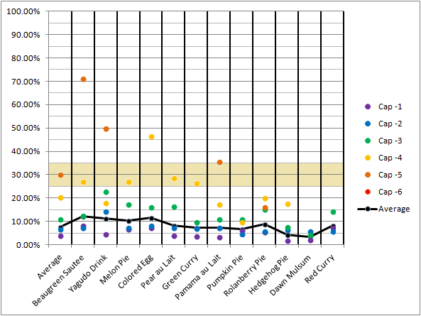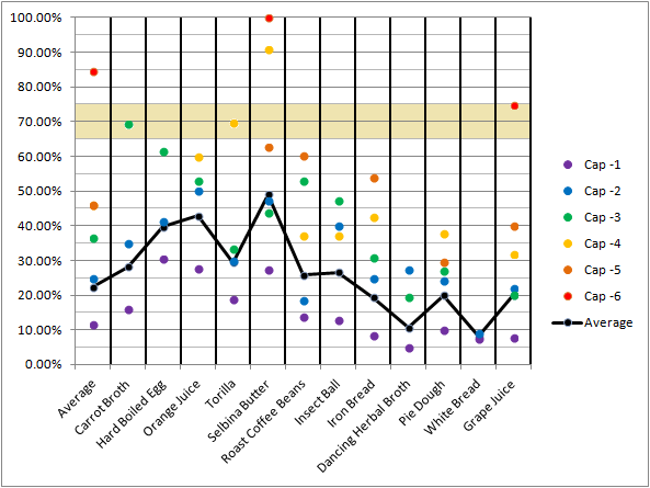 For ease of explaining I also highlighted the region that results should be falling, as theorized by both BG and FFXIwiki. I have also color coded each recipe red to purple based on distance from cap. Ideally each column should show a rainbow moving top to bottom.