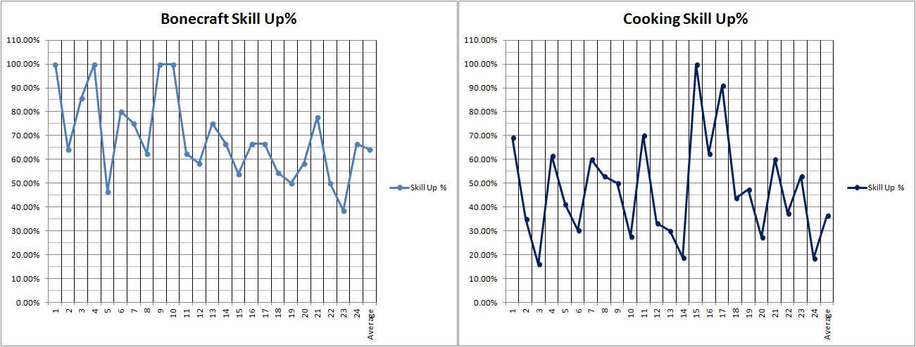 Here are two graphs divided 0-50 and 50-100 showing the average skill up rate per level and average based on skill from cap.