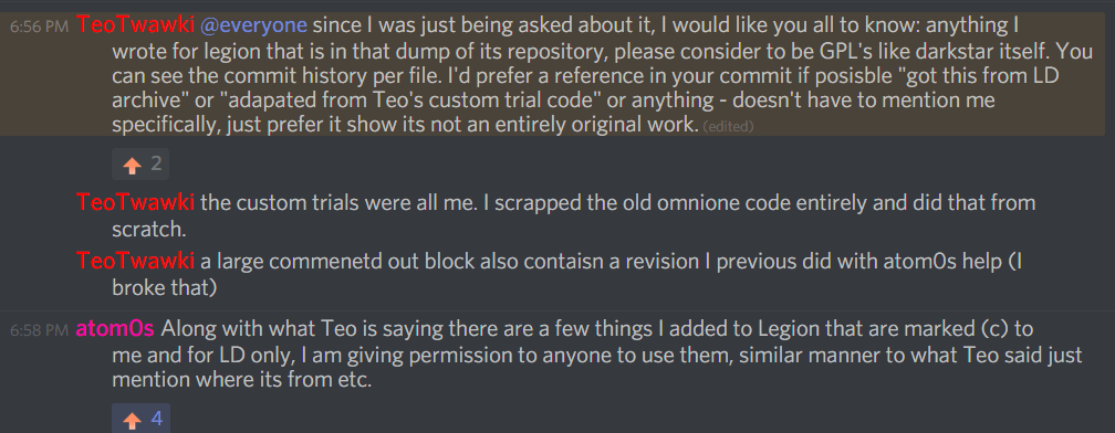[6:56 PM] TeoTwawki: @everyone since I was just being asked about it, I would like you all to know: anything I wrote for legion that is in that dump of its repository, please consider to be GPL's like darkstar itself. You can see the commit history per file. I'd prefer a reference in your commit if posisble "got this from LD archive" or "adapated from Teo's custom trial code" or anything - doesn't have to mention me specifically, just prefer it show its not an entirely original work.