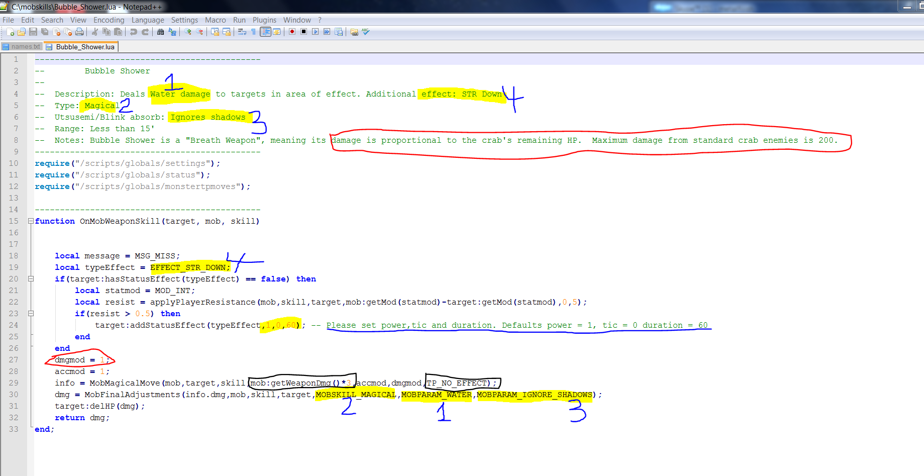 Example 3 shows you what matches up with what so if you see 1 is Fire but on the bottom says Earth then change it to Fire. Anything in yellow means match it up. Red shows you that you may have to look at the additional notes for modification of normal damage, for this script you would change dmgmod = 1; to a formula that represents the notes. Also the black circles items show other thing st look for such as mobWeaponDmg which can be multiplied by 1-3 to change dmg up a bit and that you should keep an eye on TP modifier in case it was not added properly.