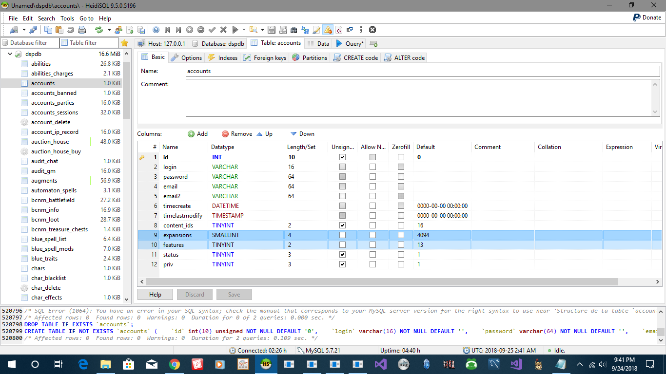 SQL: INSERT INTO accounts(id,login,password,timecreate,timelastmodify,status,priv) VALUES(1000,'B142',PASSWORD('5590'),'2018:09:22 21:33:16',NULL,1,1);